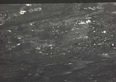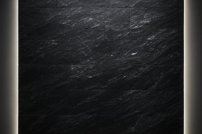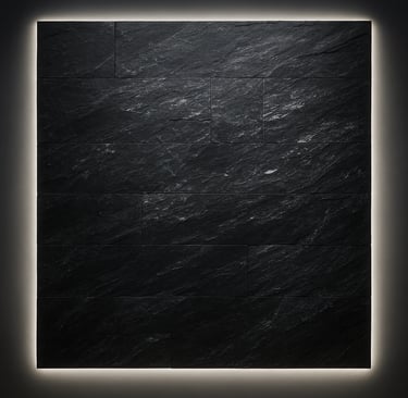 Su base grisácea y azulada, atravesada por suaves ondulaciones y vetas blancas, se combina con matices verdosos que aportan profundidad y dinamismo.