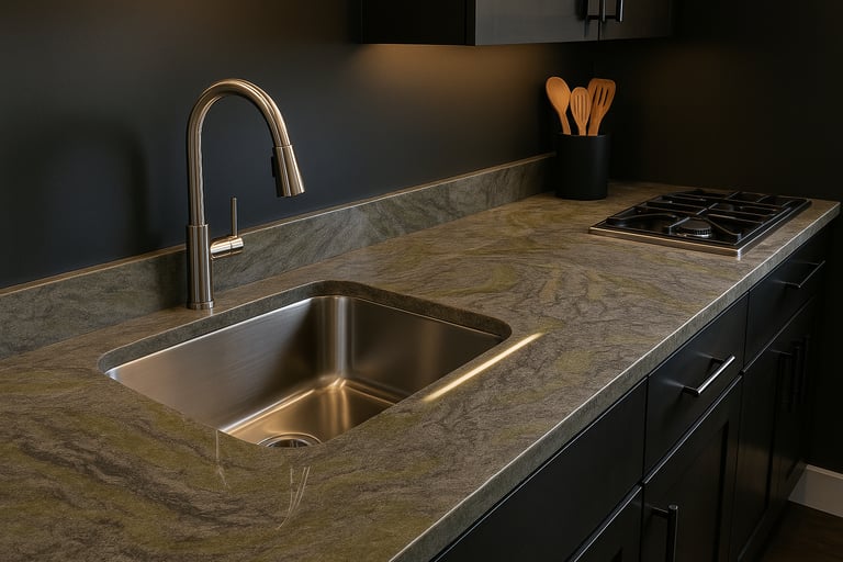 La Cuarcita Silver Blue Macael es una piedra natural de gran resistencia y belleza singular. Su base azulada, atravesada por suaves ondulaciones y vetas oscuras, se combina con matices dorados y verdosos que aportan profundidad y dinamismo. Una pieza de carácter contemporáneo, inspirada en la fuerza de la naturaleza y en la sobriedad mediterránea.