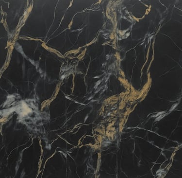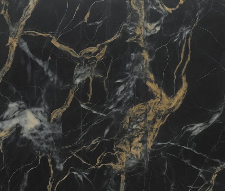 Mármol intenso y sofisticado, de fondo negro profundo atravesado por vetas doradas y ámbar que aportan movimiento y distinción. Su composición compacta y su contraste natural lo convierten en una piedra de gran presencia visual y carácter escultórico.