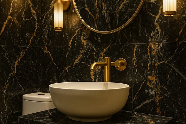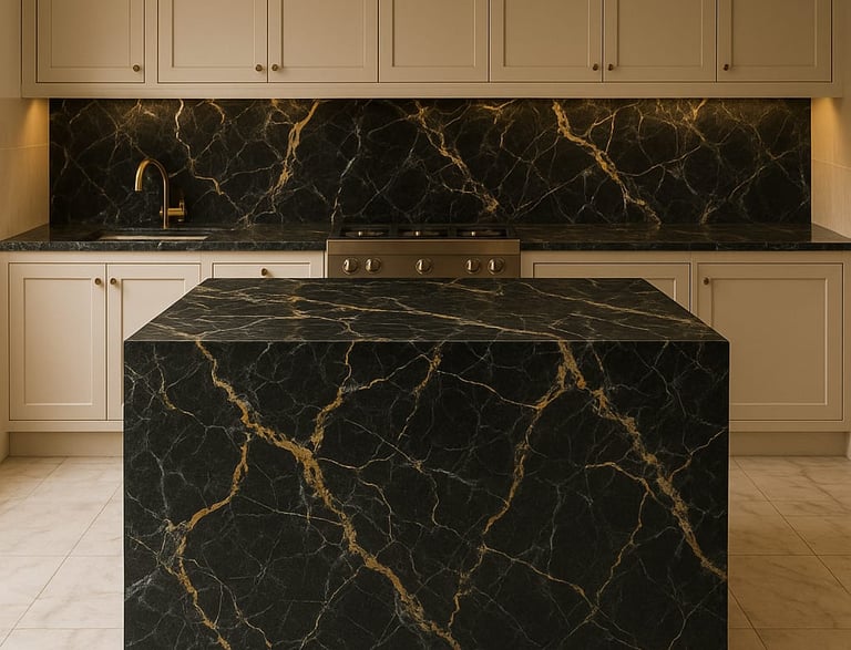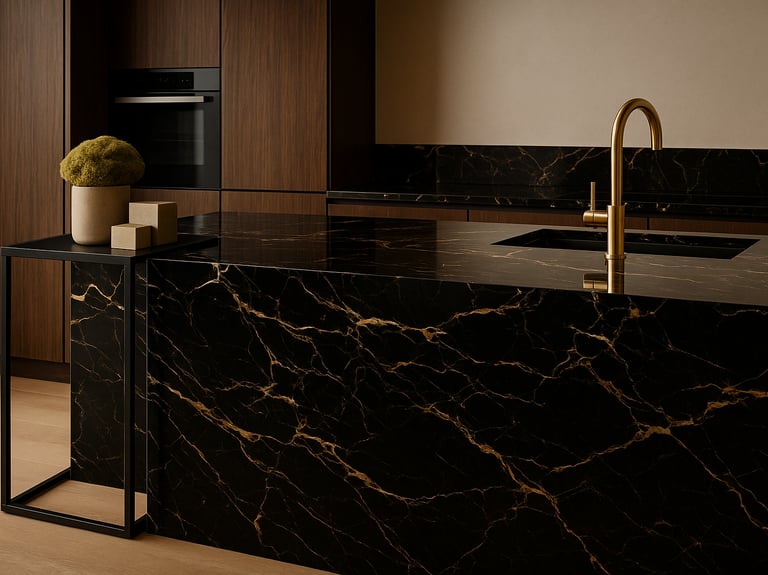 El Negro Portoro Macalux encarna la esencia del lujo sobrio y atemporal —la piedra en su expresión más pura y majestuosa.as doradas